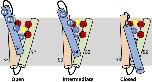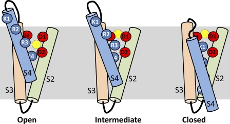 Figure 20. Schematic showing state-dependent positions of Cd2+ and key charged residues in S2–S4 segments of the VSD of a single hERG1 channel subunit. According to this model, Cd2+ is displaced in an outward direction by basic residues in the S4 segment as it moves inward in response to membrane repolarization. (Left) VSD at depolarized potentials and Cd2+ in its “depolarized” coordination site. (Right) VSD at a negative transmembrane potential when all channels are closed and Cd2+ located in a position defined as the “repolarized” coordination site. (Middle) A putative intermediate state of the channel. K1, K525; R2, R528; R3, R531; R4, R534; D1, D456; D2, D460; D3, D509. The yellow circle represents a Cd2+ ion. |