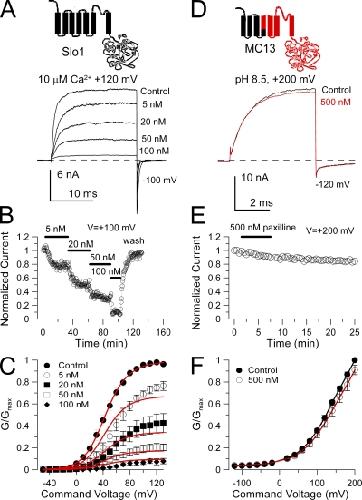 Figure 1. Paxilline blocks Slo1, but not Slo3 current. (A) Traces show block of Slo1 by paxilline, and the general topology of the Slo1 α subunit is shown on the top. Currents were activated by a step to +120 mV in an inside-out patch exposed to 10 µM Ca2+ with the indicated concentrations of paxilline. The holding potential was 0 mV, but the command steps were preceded by a brief 10-ms step to −140 mV. (B) The time course of paxilline block and unblock of Slo1 current is illustrated. Steps were to +100 mV. (C) G-V curves were generated from steady-state current levels for recordings in the absence and presence of paxilline (n = 4–7 patches). For this set of data, paxilline was applied at increasing concentrations, and full washout was not usually achieved (see B). Red lines correspond to a fit of Eq. 1, with Kb = 10.6 ± 0.49 nM with zc = zo = 0 e. (D) 500 nM paxilline is without effect on MC13 currents activated at +200 mV with pH 8.5. The composition of the MC13 construct is schematized at the top with Slo3 sequence shown in red. (E) MC13 currents are unaltered by 500 nM paxilline during 6 min of application. (F) 500 nM paxilline has little effect on MC13 G-V curves.