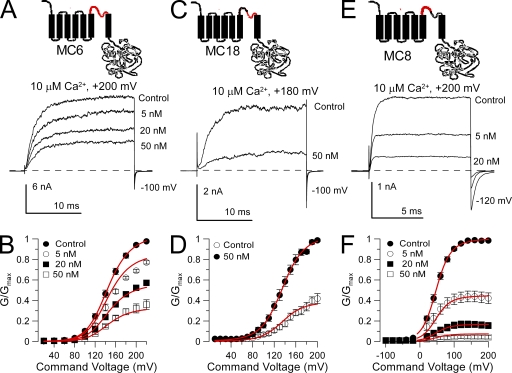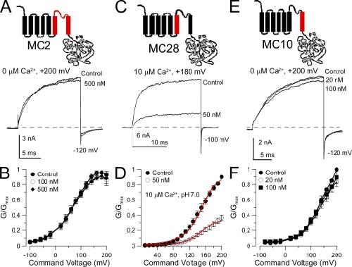 Figure 3. Replacement of the Slo1 S6 segment with the Slo3 sequence abolishes sensitivity to paxilline. (A) Replacing the Slo1 S5–P loop–S6 segment with the homologous Slo3 sequence (chimera MC2) abolishes paxilline sensitivity. The MC2 construct is diagrammed at the top. Traces show MC2 currents activated with 10 µM Ca2+ at +200 mV with and without 500 nM paxilline. (B) Paxilline has no effect on MC2 G-V curves (n = 4 patches). (C) Paxilline sensitivity persists after replacement of the Slo1 S5 segment with the homologous Slo3 sequence. The MC28 construct is diagrammed at the top. Traces show MC28 currents activated with 10 µM Ca2+ at +180 mV with and without paxilline. (D) G-V curves for MC28 with and without 50 nM paxilline (n = 3 patches) are shown. Red lines correspond to a fit of Eq. 1, with Kbc = Kbo = 30.4 ± 1.7 nM with no voltage dependence. (E) Paxilline sensitivity is lost when the Slo1 S6 segment is replaced with the homologous Slo3 sequence. The MC10 construct is diagrammed at the top. Traces show MC10 currents activated with 0 Ca2+ at +200 mV with and without paxilline. MC10 is strongly activated by Ca2+, but like Slo3 and MC13, it is also strongly blocked by µM Ca2+. (F) G-V curves are shown for MC10 with and without paxilline (n = 4 patches).