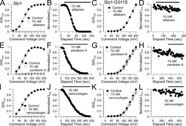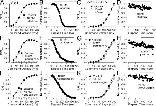 Figure 9. Block of BK channels by other fungal alkaloids is also abolished by the G311S mutation. (A) A Slo1 G-V curve for activation with 10 µM Ca2+ is plotted for currents measured in the absence and presence of 10 nM aflatrem (n = 4 patches). (B) The time course of block by 10 nM aflatrem is shown for one patch. (C) 10 nM aflatrem is without effect on the G-V elicited by 10 µM Ca2+ for the Slo1-G311S construct. (D) Over 4 min of application of 10 nM aflatrem produces no reduction in current of Slo1-G311S. (E) The effect of 10 nM penitrem A on the Slo1 G-V curve is plotted. (F) The time course of block of Slo1 by penitrem A is plotted. (G) 10 nM penitrem A is without effect on Slo1-G311S conductance. (H) Over 5 min of application of 10 nM penitrem A has no effect on Slo1-G311S current. (I) Block of the Slo1 G-V by 10 nM verruculogen is plotted. (J) The time course of verruculogen block is displayed. (K) 10 nM verruculogen is without effect on Slo1-G311S conductance. (L) Over 5 min of verruculogen application is without effect on Slo1-G311S current.
