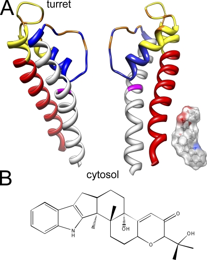 Figure 2. S5–pore loop–S6 segments of the BK channel and the relative size of the paxilline molecule. (A) A homology model of the BK channel S5–pore loop–S6 structure was generated based on alignment with Kv1.2 and the available Kv1.2 crystal structure. Coloring identifies segments used for generation of chimeras as follows: red, S5; yellow, first half of pore loop; blue, second half of pore loop, including so-called turret; gray, S6. Orange residues are those that influence iberiotoxin binding (Giangiacomo et al., 2008). G311 in S6 is highlighted in magenta. A space-filling model of paxilline (to the same scale) is positioned adjacent to an S5 helix, but this positioning is not meant to imply anything about the position of paxilline in a blocking site. Note that the actual topology of the BK turret is entirely unknown. Furthermore, this cartoon does not take into account the likely large width of the BK central cavity. (B) The chemical structure of paxilline is shown.