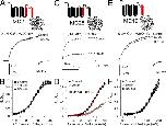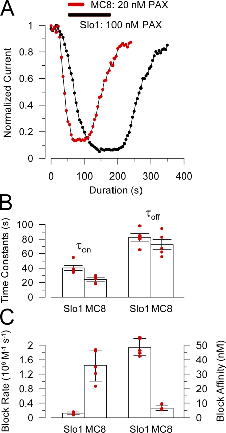 Figure 5. Replacing the first half of the Slo1 P loop with the Slo3 sequence increases paxilline block affinity and speeds up paxilline block and unblock rates. (A) The time course of onset and recovery of paxilline block for Slo1 (black) and MC8 (red) is shown for representative inside-out patches for each construct. For MC8, 20 nM paxillline was applied (horizontal bar), and 100 nM was used for Slo1. Peak current activated at +200 mV was measured every 2 (Slo1) or 3 (MC8) seconds and plotted against time. (B) Time constants of onset of paxilline block (τon) and recovery (τoff) are plotted for Slo1 (at 100 nM) and MC8 (at 20 nM). Red dots are individual determinations, and bars indicate means and SEM. (C) The forward block rate and paxilline block affinity were calculated for each individual patch for Slo1 and MC8. Block rate (left axis) and affinity (right axis) were determined from τon = 1/([PAX]kf+ku), ku = 1/τoff, and Kb = ku/kf.