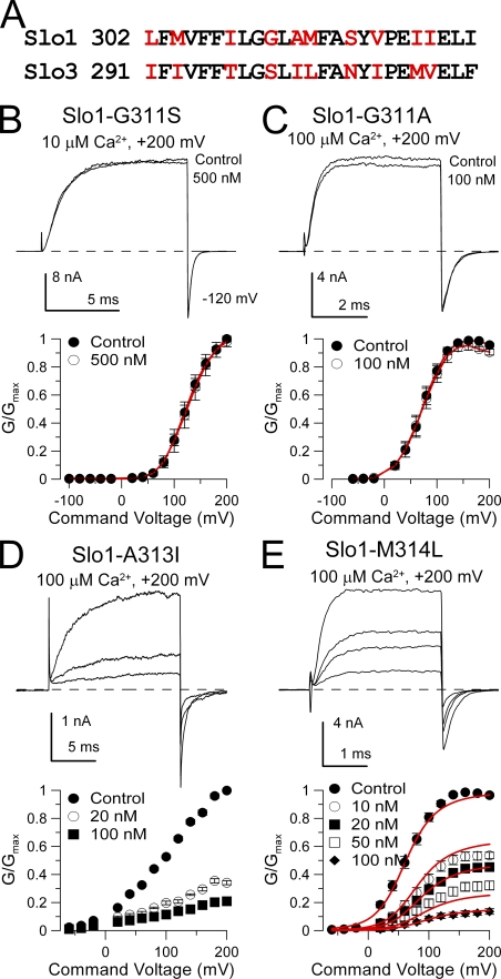 Figure 6. Mutation of glycine 311 in Slo1 S6 abolishes high affinity block by paxilline. (A) A consensus alignment of Slo1 and Slo3 S6 segments is shown. Non-conserved residues are in red. (B) Paxilline is without effect on Slo1-G311S. Currents were activated with 10 µM Ca2+ at +200 mV, and 500 nM paxilline produces no effect. On the bottom, G-V curves for Slo1-G311S with and without 500 nM paxilline (n = 3 patches) are plotted. (C) Paxilline is without effects on Slo1-G311A. Currents were activated with 10 µM Ca2+ at +200 mV, and 500 nM paxilline had only a minor effect. G-V curves plotted on the bottom also show lack of paxilline effect (n = 5 patches). (D) Paxilline sensitivity persists in Slo1-A313I. Currents activated with 100 µM Ca2+ are blocked by 20 and 100 nM paxilline, as also shown in the G-V curves on the bottom (n = 5 patches). (E) Paxilline blocks Slo1-M314L. Currents activated with 100 µM Ca2+ are blocked in a concentration-dependent fashion by paxilline, as summarized in the G-V curves on the bottom (n = 8 patches). Red line corresponds to fit with equivalent voltage-independent block of open and closed states with Kb = 13.3 ± 0.80 nM.