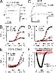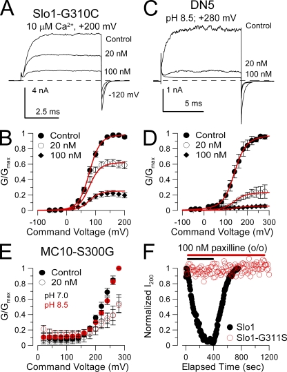 Figure 8. Other tests of factors influencing paxilline block. (A) Paxilline blocks construct Slo1-G310C. Traces show reduction of Slo1-G310C currents by the indicated paxilline concentrations with 10 µM of cytosolic Ca2+ and steps to +200 mV. (B) G-V curves are shown for paxilline block of Slo1-G310C. Red line corresponds to fit of voltage-independent block of open and closed states with Kb = 34.6 ± 1.8 nM. (C) Paxilline blocks DN5. Traces show paxilline block of DN5 in which the Slo1 cytosolic structure is replaced by Slo3. Currents were activated with cytosolic pH 8.5 with steps to +280 mV. (D) G-V curves are shown for paxilline block of DN5. Red lines show a fit with Kb = 6.3 ± 0.3 nM with z = 0 e. (E) Paxilline block on MC10-S300G G-V curves is similar at either pH 7.0 (black) or pH 8.5 (red). In both cases, 20 nM paxilline produces similar block. (F) Points plot the peak current during the application of 100 nM paxilline applied to outside-out patches expressing either Slo1 (black) or Slo1-G311S (red). Currents were activated by steps to +200 mV with 10 µM of pipette Ca2+ with a holding potential of 0 mV.