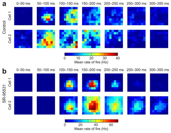Figure 7. GABAergic circuits reduce spatiotemporal correlations in tectal receptive fields. (a) Receptive fields were analyzed in the temporal domain by separating responses according to when they occurred after the onset of the flashed stimuli. Data from two representative control cells are shown for seven different time bins (each 50 ms long) following the onset of the stimuli. As a population, control cells showed greater variety in their responses at different times and different locations of visual space (n = 21 cells). Associated with this variability was the fact that stimuli in some regions of a control cell's receptive field would typically elicit early responses (for example, 50–100 ms post-stimulus), whereas stimuli in other locations would generate later responses (for example, 200–250 ms post-stimulus). (b) In contrast with control cells, the population of cells recorded under GABAA receptor blockade showed similar responses at different times and locations of visual space (n = 7 cells). This is illustrated with data from two representative SR-95531 cells. Maximal responses for the SR-95531 cells occurred between 100–200 ms in post-stimulus time and typically the same receptive field locations elicited both early spikes and later spikes. The result was greater uniformity in the spatiotemporal profile of the responses of different cells in the SR-95531 condition.