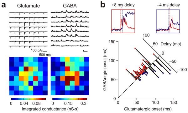 Figure 8. The timing of synaptic inputs underlies GABAergic control of tectal spiking. (a) Glutamatergic (left) and GABAergic (right) receptive fields were recorded in whole-cell voltage clamp. The strength of the synaptic inputs to a given location was defined as the integrated conductance of the postsynaptic conductances in the 500 ms following disappearance of the square. The resulting measurements were in units of nS·s, as shown here by the color-coded receptive field maps. (b) The onset latencies of glutamatergic and GABAergic inputs were variable across receptive fields. Some locations showed early glutamate followed by GABA (positive delays), some locations showed near synchronous arrival of the two inputs (zero delays), and GABAergic input preceded glutamatergic input at other locations (negative delays). Insets provide example traces showing different delays and population data are from 84 receptive field locations in 15 cells.