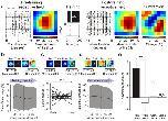 Figure 2. Moving stimuli instruct asymmetric changes in tectal receptive fields. (a) Training produced asymmetric changes in receptive fields that reflected the direction of movement of the stimulus. An example cell is shown at the top. Population data (n = 18 cells) is below, showing the mean change in the rate of fire (± s.e.m., shaded region) across visual space, when analyzed in the direction of the training stimulus (arrows). Pre, pre-training; post, post-training; sub, subtraction. (b) Changes around the center of the receptive fields exhibited significant asymmetries. Each pair of points represents the relative change of a cell's receptive field in regions activated by the training stimulus before the center (early) versus after the center (late) (**P < 0.01, paired t test.). (c) The direction of training-induced shifts in receptive field centers (indicated here as Θ) was significantly correlated with the direction of movement of the training stimuli (Pearson's r = 0.52, P < 0.05). (d) Receptive field changes in the direction orthogonal to the movement of the training stimuli were symmetric. (e) Receptive fields did not show changes in the absence of training stimuli (n = 21 cells). (f) Asymmetry coefficients (Online Methods) were significantly greater than zero in the direction of training (train), but not in the direction orthogonal to training (orth), for untrained cells at 0° (blank) or for cells that did not spike during training (no spikes, n = 2 cells). Data shown are mean ± s.e.m. (***P < 0.001, n.s. = nonsignificant (P > 0.05), t test.)