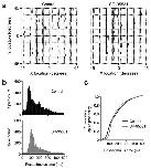 Figure 4. Effects of GABAA receptor blockade on baseline receptive field properties. (a) Receptive field raster plots from untrained cells illustrating the effect of SR-95531 application on response properties. Across different receptive field locations a control cell tended to show greater variability in the times of visually evoked spikes, whereas spikes in a SR-95531 cell tended to occur at similar times following the stimulus and during a relatively short time window. (b) Consistent with the examples in a, there were significant differences in the timing of stimulus-evoked action potentials between control and SR-95531 conditions. Comparing spike-time histograms for all responses of all cells in the two groups showed that the onset of responses in SR-95531 cells tended to be later and all spiking occurred over a narrower time window than in control cells. (c) Examination of the cumulative distribution functions for these spike-time distributions showed a highly significant difference in spike timing between the two groups (P < 0.001, Kolmogorov-Smirnov test).
