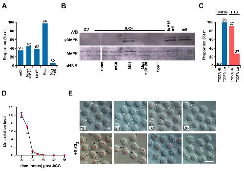 Mos establishes Emi2- and MAPK-dependent metaphase arrest but its presence is not required to sustain mII. (A) Histograms for GV oocyte injection with cRNA encoding mCherry (mCh) or mCherry fused to Mos or to the Mos dominant-negative double mutant S3A/S105A (Mosdn). Injections included the Mek inhibitor U0126 or si5â²Emi2#1 (Mos+siE), as indicated. Numbers above columns show oocyte numbers. (B) Anti-MAPK and -phospho-MAPK (pMAPK) immunoblotting of non-injected control IVM16, mII and GV oocytes or GV oocytes injected with cRNA as in A and held in IBMX (IB24) (see Fig. S1A in the supplementary material). Upper and lower panels show the same blot. (C) Percentages of oocytes arrested at mI in the IVM16 or si16 systems (see Fig. S1B,C in the supplementary material) following injection with cRNA encoding the Emi2T327A (T327A). Lo, the default [cRNA] throughout (0.5-1.0 mg/ml); Hi, [RNA]=2.0-2.5 mg/ml. (D) Densitometric quantification of anti-Mos immunoblots of oocytes at the times shown post-hCG. See also Fig. S2C in the supplementary material. (E) Paired Hofmann images of mature oocytes at the ages indicated post-hCG (in hours), and (underneath) the same or equivalent oocytes 6 hours after exposure to 10 mM SrCl2. Black arrowheads, Pb; red arrowheads, pronuclei; white arrowheads, protuberances caused by mII spindles/plates. Error bars indicate s.e.m. Scale bar: 100 μm.