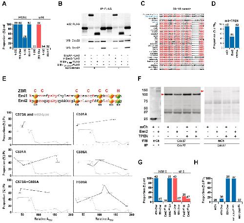Mouse Emi2 comprises separable functional domains. (A) Percentages of oocytes arrested at mI in the IVM16 or si16 systems (see Fig. S1B,C in the supplementary material) following injection with cRNAs encoding different Emi2 constructs. Values below the x-axis correspond to Emi2 residue numbers. (B) Immunoblotting of lysates from NIH 3T3 cells transfected (tf) as indicated, in the presence or absence of nocodazole, and subjected to anti-FLAG immunoprecipitation (IP) with beads to capture complexes containing FLAG (uppermost), or endogenous Cdc20 (centre) or Cdc27. (C) Optimal species alignment with mouse Emi2 residues 80-115. Residues that are identical in more than 50% of the sequences are shown in red. (D) Intact mII oocytes were injected with cRNA encoding mCherry (mCh), Emi2-mCherry or Emi2C573A (C573A), exposed to TPEN (10 μM) after 4 hours then scored for Pb2 extrusion 1.5 hours later. (E) Alignment of parts of mouse Emi1 and Emi2 (with Emi2 residue numbering) ZBRs. Varying [cRNA] encoding Emi2 mutants were injected in the si16 system, and fluorescence quantified (x-axis) and plotted against the proportion emitting a Pb (average 14.8 oocytes/point). The wild-type Emi2 profile is shown on each plot for comparison (grey). (F) Western blotting of lysates from NIH 3T3 cells transfected with mCherry or Emi2-mCherry (Emi2) (leftmost) and following IP to capture endogenous Cdc27. Red arrowheads mark complexes containing Cdc27 (left) and Emi2-mCherry. Cells were incubated in 100 μM TPEN prior to collection as indicated. (G) cRNAs encoding Emi2491-Cter (491-Cter), Emi2551-Cter (551-Cter) or Emi2δD (D-box double mutant, R511A, L514A) injected in the IVM16 or si16 systems, showing the percentage arrested at mI. Low (Lo) and high (Hi) RNA concentration are, respectively, 0.5-1.0 and 2.0-2.5 mg/ml; the Lo value corresponds to the default used in other experiments. (H) Mature mII oocytes injected with cRNA encoding mCherry (mCh), Emi2491-Cter (491-Cter), or Emi2551-Cter (551-Cter) or Emi2551-Cter containing the mutations indicated were scored for mII exit as indicated by Pb2 emission 2 hours post-injection. Values above columns show oocyte numbers. Emi2 constructs were all expressed as mCherry fusions.
