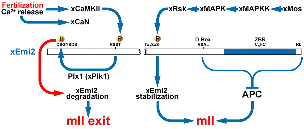 Mouse Emi2 as meiotic regulatory hub. Diagram showing interactions between principal components of mouse meiotic homeostasis and Emi2. APC, anaphase-promoting complex; CaMKIIg, calmodulin kinase II γ; D-box, destruction box; Emi2, endogenous meiotic inhibitor 2; MAPK, mitogen-activated protein (MAP) kinase; MAPKK, MAP kinase kinase; Mos, Moloney sarcoma oncogene; Plk1, polo-like kinase 1; ZBR, zinc-binding region. A broken line shows a presumptive, possibly indirect, stabilization role for Emi2 residues 80-115. There is no evidence for the indispensable involvement of CaN.