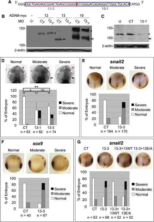 Figure 1. The Metalloproteinase Activity of ADAM13 Is Required for Xenopus CNC Induction(A) cDNA sequence of adam13 showing the translation start site (red) and targets of MOs 13-1 and 13-3.(B) One blastomere of two-cell stage embryos was injected with MO 13-1 (6 ng) and transcripts encoding myc-tagged ADAMs (ADAM12 or 13: 200 pg; ADAM19: 100 pg). Embryos were cultured for 20 hr and western blot of whole-embryo lysates carried out using an anti-myc antibody.(C) Western blot of stage 11â12 embryo lysates showing KD of endogenous ADAM13 by injection of MO 13-1 at one-cell stage (12 ng MO/embryo; 20 embryos/lane).(D) Headcartilage phenotypes of ADAM13 KD. One anterior-dorsal blastomere of eight-cell stage embryos was injected with the indicated MO (1.5 ng). Embryos were allowed to develop to stage 46 and scored for headcartilage defects. Images were gray-scale inverted for easier visualization of headcartilage. One example of each phenotype is shown in the upper panels, and results of three independent experiments are graphed in the lower panel (error bars represent SDs). *p = 0.03; **p = 0.005; NS, not significant (p = 0.43). See Figure S1D and Experimental Procedures for details on phenotype scoring and statistics.(E and F) Four-cell stage embryos were injected in one anterior-dorsal blastomere with 3 ng MO 13-3, allowed to develop to stage 12.5/13, and then processed by in situ hybridization for snail2 (E) or sox9 (F).(G) Embryos were injected with the indicated MO (3 ng) and ârescueâ transcripts (100 pg each), and in situ hybridization performed as in (E). Red asterisks in (D)â(G) denote injected side.Single and double arrowheads in (B) and (C) point to the pro- and mature forms of ADAMs, respectively, and arrows in (D) point to impaired headcartilage structures as compared with the uninjected side. U, uninjected; CT, control MO; n, number of embryos scored (same below).