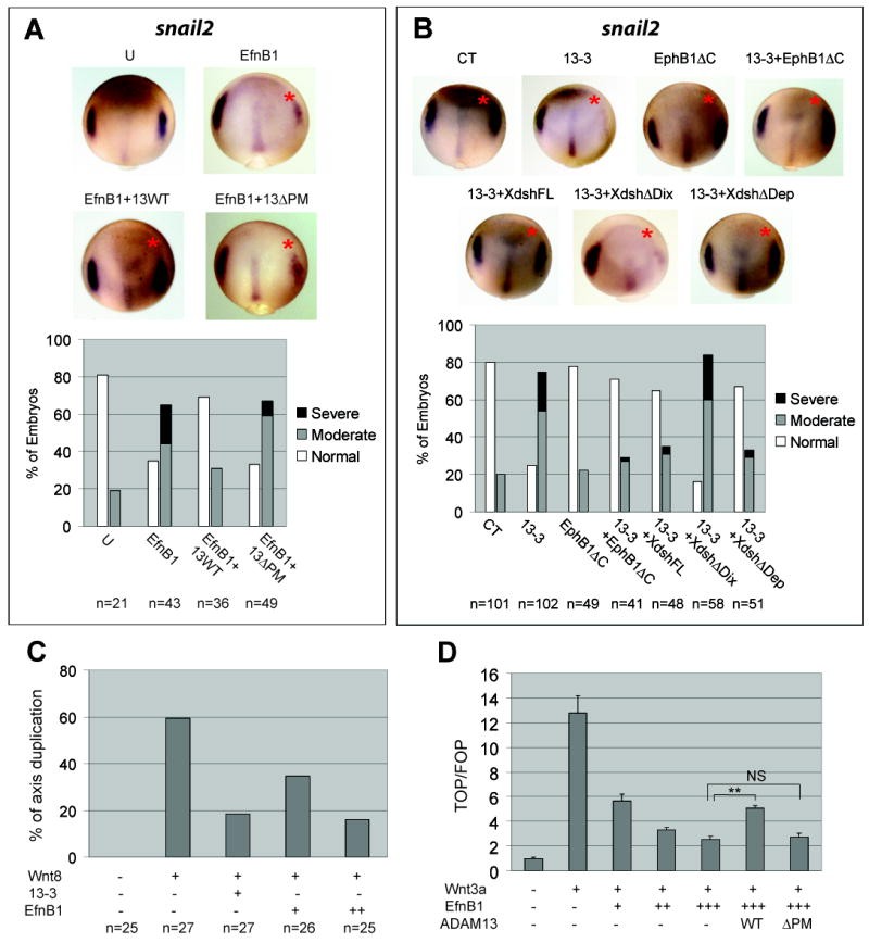 (A, B) Embryos were injected as in Figure 1E with transcripts as follows: 200 pg EfnB1 and 100 pg ADAM13 in (A), and 200 pg each in (B) along with 3 ng of control (CT) or 13-3 MO. In situ hybridization was processed for snail2 at stage 12.5/13; injected side is denoted with a red asterisk. (C) Embryos were injected in one ventral-vegetal blastomere at 16-cell stage with the indicated RNA (1.5 pg Wnt8; 100 or 200 pg EfnB1) and MO 13-3 (1.5 ng), and scored for secondary axis formation at tailbud stages. (D) HEK293T cells were transfected with pTopflash or pFopflash, pCMV-β-gal and the indicated constructs, and cultured for ~40 hrs. Cell lysates were processed for luciferase and β-galactosidase assays as controls for transfection efficiency. A representative experiment performed in triplicate is shown here. Results are presented as ratios of TOPFLASH vs. FOPFLASH luciferase activity (both were normalized for β-gal activity), and the value calculated for cells transfected with control plasmids only was set to 1. Error bars represent standard deviations. **: P < 0.001; NS: not signicicant (P = 0.71). U, uninjected.