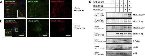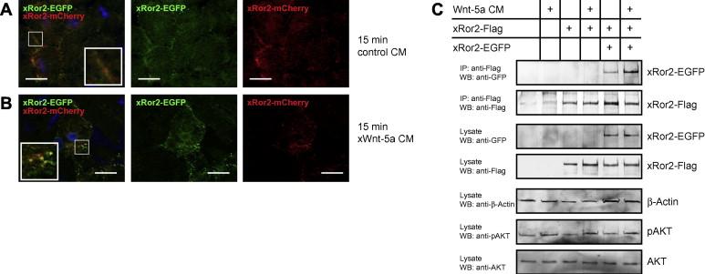 Fig. 1. xRor2 clusters in response to Wnt-5a. (A) EGFP- and mCherry-tagged xRor2 was expressed in Xenopus embryos (NF stage 10) after injection of 30 pg RNA each. In Animal Caps incubated in control CM for 15 min, both proteins partially co-localized at the cell membranes. (B) Stimulation with xWnt-5a CM induced a more pronounced co-localization at the membrane and intracellularly. (C) Co-immunoprecipitation of xRor2-Flag and xRor2-EGFP overexpressed in Cos-1 cells was strongly increased after stimulation with Wnt-5a conditioned medium for 15 min. Wnt-5a stimulation also induced AKT phosphorylation, indicating activation of PI3K. |