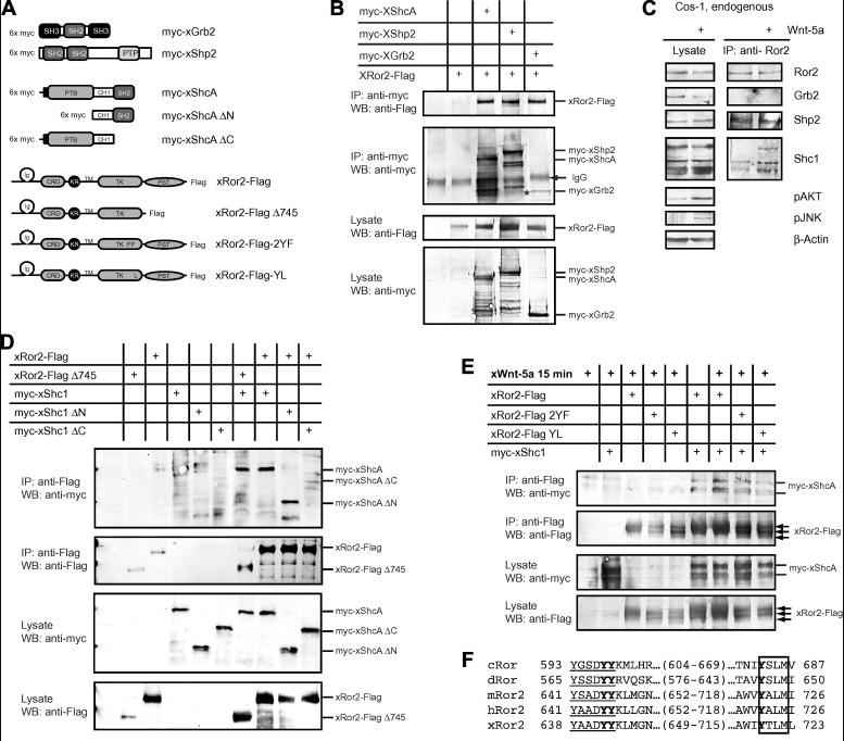 Fig. 2. SH2-domain proteins bind to xRor2. (A) Schematic illustration of xGrb2, xGab1, xShp2, xShcA and xRor2 constructs used for co-immunoprecipitation. (B) myc-tagged xShcA (NCBI NM_001090463), xShp2 (NCBI BC073687), and xGrb2 (NCBI AJ223061) were co-expressed with xRor2-Flag in Cos-1 cells. All proteins co-immunoprecipitated with xRor2-Flag without Wnt-5a stimulation. (C) Endogenous Ror2 was immunoprecipitated from Cos-1 cells stimulated with control CM and Wnt-5a CM for 15 min and co-immunoprecipitation of endogenous proteins was detected by immunoblotting. Activation of PI3K and JNK was monitored by AKT and JNK phosphorylation. (D) Co-immunoprecipitation of xShcA and xRor2 in Cos-1 cells: xShcA bound equally well to FL xRor2 and to xRor2Î745. xShcAÎN, lacking the PTB-domain, was still able to bind to xRor2, but xShcAÎC, lacking the SH2-domain, failed to do so. (E) Co-immunoprecipitation of xShcA and xRor2 in HEK 293 cells was induced by xWnt-5a stimulation. Mutation of Y642 and Y643 (xRor2-Flag 2YF) moderately, mutation of Y719 (xRor2-Flag-YL) strongly reduced binding of xShcA to xRor2. Arrows indicate xRor2-Flag bands. (F) Conserved tyrosine residues mutated in xRor2-Flag 2YF and xRor2-Flag-YL are indicated in bold type, the conserved Shc-SH2 binding motif is boxed, the motif described as required for activation of the related RTK TrkA [23] is underlined. The respective regions of C. elegans Ror (Cam-1, NCBI NP_001021907.1), Drosophila melanogaster Ror (AAF52885), human (NCBI NP_004551.2) and mouse Ror2 (NCBI NP_038874.3) are aligned with the xRor2 sequence (NCBI NP_001082312); numbers indicate the respective amino acid. |