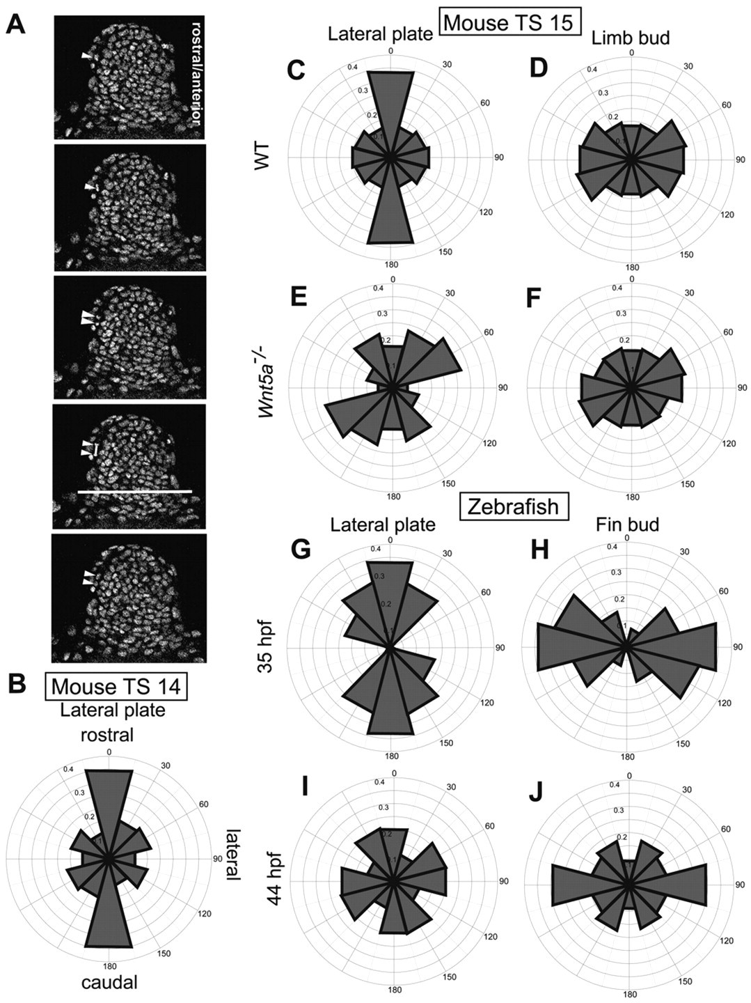 Fig. 5. Evidence for regionally localised oriented cell division during early limb development in mouse and zebrafish. (A) Method of measuring cell division angle. h2af/z:gfp transgenic zebrafish chromatin undergoing mitosis (arrowheads) is visualised on successive frames. The angle of a line joining the daughter chromatin centres at telophase is measured with reference to the longitudinal axis of the lateral plate mesoderm (fourth frame down). The level at which the limb bud protruded beyond the lateral plate was selected as the boundary between these two regions on every individual z-stack (long white line, fourth frame down). Every mitotic angle visualised on all z-stacks, together encompassing the entire limb bud, was measured over the whole duration of each time-lapse experiment. (B-J) Polar plot representations of cell division planes in which the rostrocaudal axis is defined at 0/180°, and the lateral and future distal axis of the limb bud is defined at 90°. The proportion of cell divisions in each 30° segment is represented by the length of the segment. (B) During mouse Theiler stage 14 (18 somites), lateral plate mesoderm adjacent to somites 8-12 exhibits a preferential plane of cell division that is parallel to the rostrocaudal embryo axis. At Theiler stage 15 (21-25 somites), although the same preferential plane of division is found in the lateral plate (C), cells in the early limb bud exhibit a different orientation of division that is perpendicular to the rostrocaudal axis, but parallel to the direction of bud outgrowth (D). In Wnt5aâ/â mutants, orientation of cell division in the lateral plate is less apparent (E), although some orientation in the limb bud is evident (F). This finding correlates with the severe shortening and lack of tissue movement in the lateral plate mesoderm of Wnt5aâ/â mutants, whereas budding of the limbs takes place with evident cell movement, as seen in Fig. 1. In zebrafish at 35 hpf, the orientation of cell division is similar to that of the mouse embryo (G), although more pronounced in the limb bud (H). By 44 hpf, orientation of cell division in the lateral plate is lost (I), while it persists in the fin bud (J). |