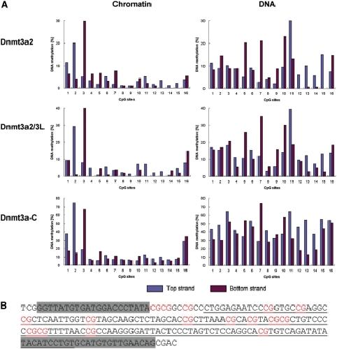 Figure 3. DNA methylation of unmodified chromatin and naked DNA by full-length Dnmt3a2, full-length Dnmt3a2/Dnmt3L complex and Dnmt3a-C. DNA methylation analysis was performed for both strands of DNA in chromatin substrates and DNA. Results shown are the average of three independent experiments. Altogether about 250 clones were sequenced for each strand and each data point. (A) Methylation levels of single CpG sites in the upper and lower strand of the DNA. (B) DNA sequence of the 601 monomeric unit (200 bp). The grey color shades the sequences of the forward and reverse primers. The red-color-labeled CpG sites were analyzed in this study. The nucleosome positioning sequence (147 bp) is underlined.