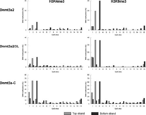 Figure 4. DNA methylation levels of single CpG sites in chromatin with H3K4me3 or H3K9me3 modifications by full-length Dnmt3a2, full-length Dnmt3a2/Dnmt3L and Dnmt3a-C. Results shown are the averages of three independent experiments. Altogether about 250 clones were sequenced for each strand and each data point.