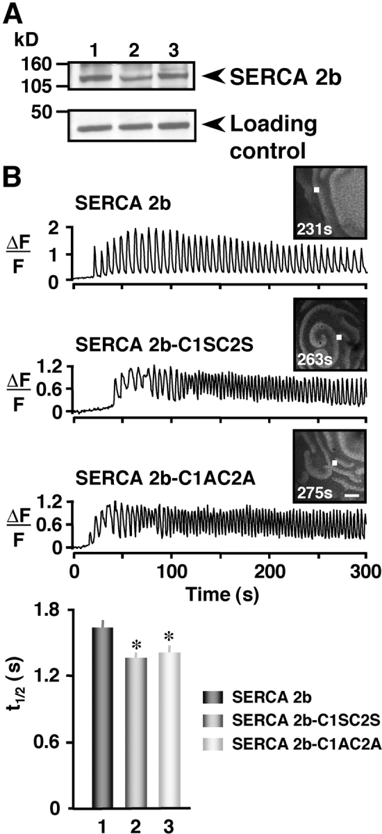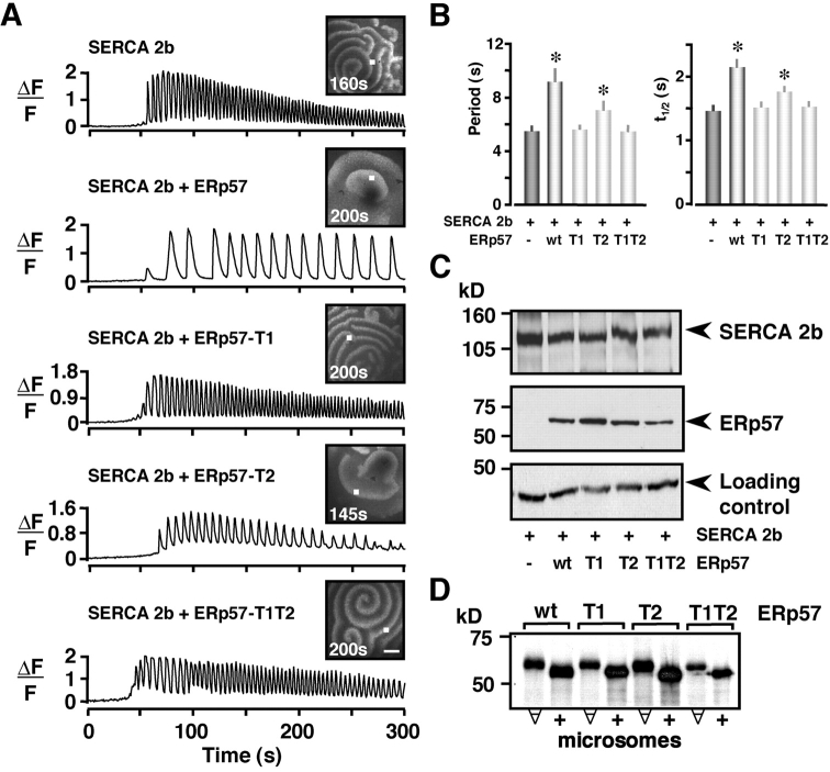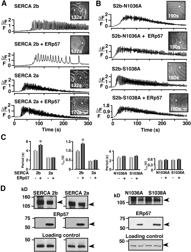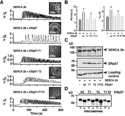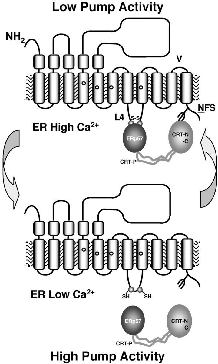 We demonstrated previously that calreticulin (CRT) interacts with the lumenal COOH-terminal sequence of sarco endoplasmic reticulum (ER) calcium ATPase (SERCA) 2b to inhibit Ca2+ oscillations. Work from other laboratories demonstrated that CRT also interacts with the ER oxidoreductase, ER protein 57 (also known as ER-60, GRP58; ERp57) during folding of nascent glycoproteins. In this paper, we demonstrate that ERp57 overexpression reduces the frequency of Ca2+ oscillations enhanced by SERCA 2b. In contrast, overexpression of SERCA 2b mutants defective in cysteines located in intralumenal loop 4 (L4) increase Ca2+ oscillation frequency. In vitro, we demonstrate a Ca2+-dependent and -specific interaction between ERp57 and L4. Interestingly, ERp57 does not affect the activity of SERCA 2a or SERCA 2b mutants lacking the CRT binding site. Overexpression of CRT domains that disrupt the interaction of CRT with ERp57 behave as dominant negatives in the Ca2+ oscillation assay. Our results suggest that ERp57 modulates the redox state of ER facing thiols in SERCA 2b in a Ca2+-dependent manner, providing dynamic control of ER Ca2+ homeostasis.