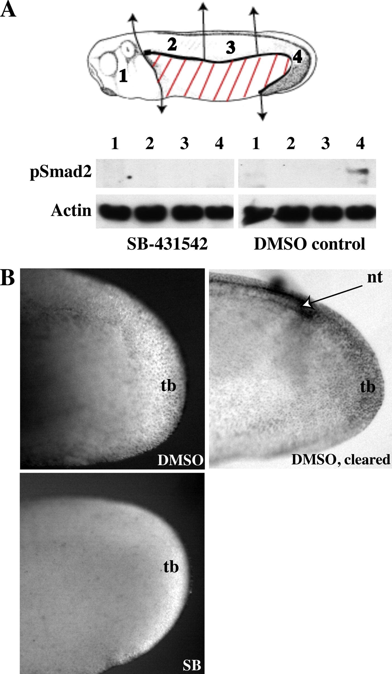 Fig. 1. p-Smad2 expression in stage 26 embryos. (A) Embryos treated with 100 μM SB-431542 or 0.2% DMSO from stage 13 were dissected into regions 1â4 (head, anterior dorsal trunk, medial dorsal trunk, and posterior dorsal trunk/tailbud, respectively) as indicated on the schematic and Western blotted for p-Smad2. Actin serves as a loading control. (B) Stage 26 embryos treated with SB-431542 or DMSO as in (A) were immunostained with anti-p-Smad2. Tailbuds of stained embryos were photographed without clearing (left column) or with clearing (right column, DMSO only; cleared SB-431542 tailbuds are not shown, as they were almost impossible to photograph due to lack of staining and contrast). tb, tailbud; nt, posterior neural tube.