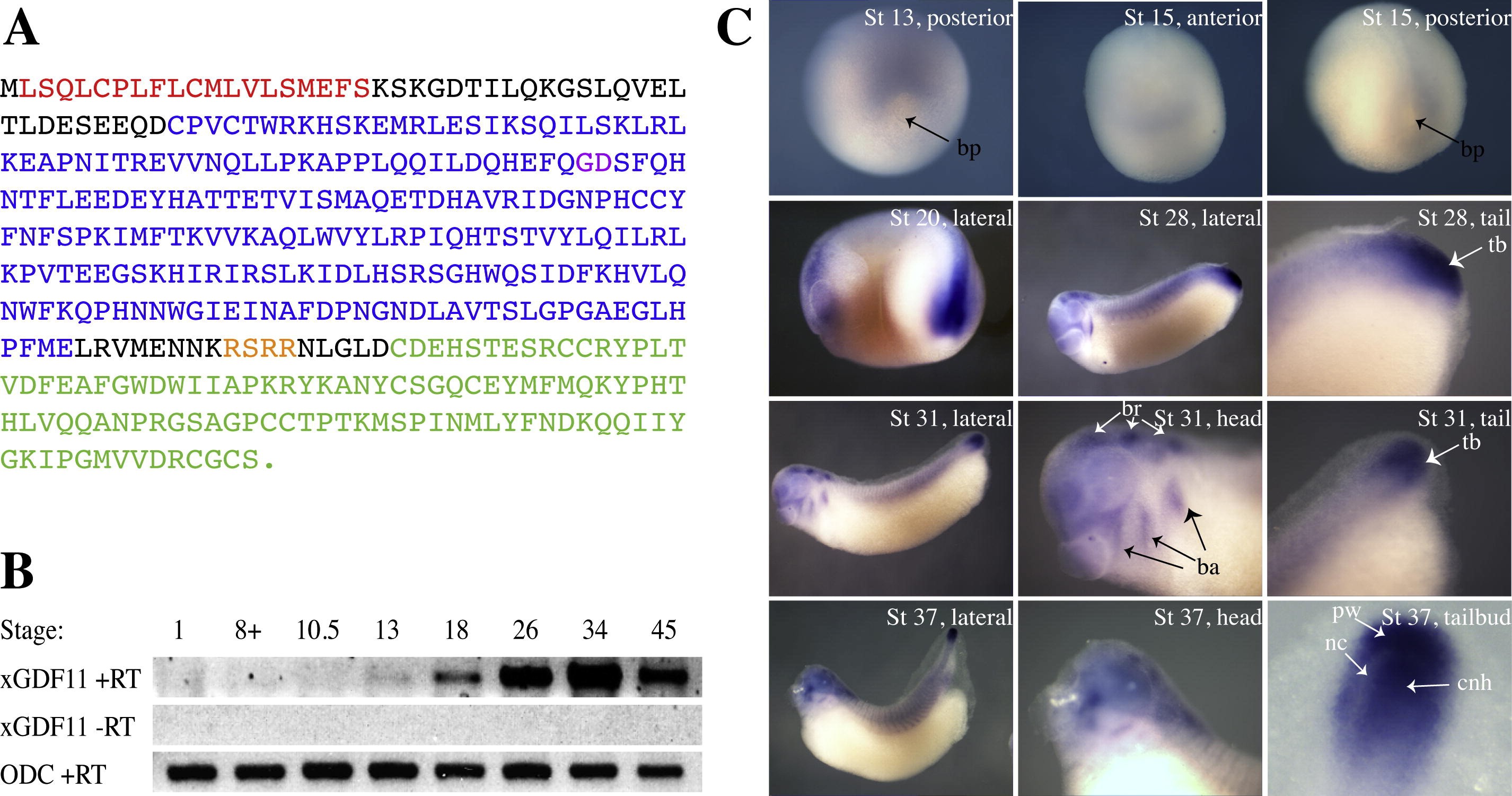Fig. 3. Expression of Xenopus GDF11. (A) Sequence of Xenopus GDF11 protein. The following conserved regions are present: putative signal sequence (red), TGFβ propeptide domain (blue), TGFβ mature domain (green). Cleavage sites for BMP-1/Tolloid protease (GD, purple) and furin protease (RSRR, orange) are also indicated. (B) Temporal expression profile of xGDF11. RT-PCR was performed on whole embryo samples harvested at indicated stages. xGDF11 RT-PCR was performed on both +RT and âRT samples. Ornithine decarboxylase (ODC) was used as a loading control. (C) In situ hybridization for xGDF11 from stages 13â37. In stages 20â37, anterior is to the left, dorsal to the top. bp, blastopore; tb, tailbud; br, brain; ba, branchial arches; nc, neurenteric canal; pw, posterior wall of tailbud; cnh, chordoneural hinge.