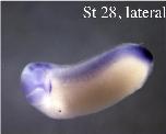 gdf11.1 ( growth differtiation factor 11, gene 1 ) gene expression in Xenopus laevis embryos, NF stage 28, as assayed by in situ hybridization, lateral view, anteriorleft, dorsal up.