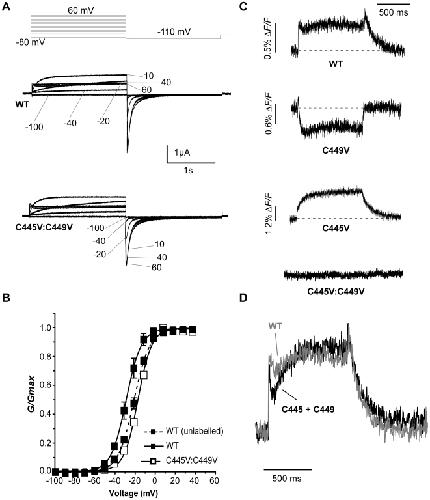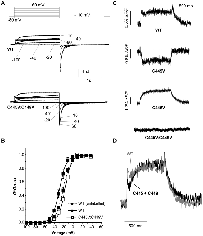 Figure 2. Endogenous cysteine residues are accessible to TMRM labelling.(A) Representative hERG currents (WT and C445V:C449V) evoked by 2 s depolarizing steps from −80 to potentials ranging from −100 to 60 mV. Membrane was then hyperpolarized at −110 mV for 2 s. (B) Comparison of WT and C445V:C449V G-V curves with (solid line) and without (dotted line) TMRM labelling, obtained by plotting the maximum tail current against voltage (WT unlabelled V½ = −19.7±1.2 mV and k = 8.1±0.2, n = 5; WT labelled V½ = −27.5±2.0 mV and k = 7.7±0.7, n = 3; C445V:C449V V½ = −15.7±0.7 mV and k = 7.1±0.3, n = 6). (C) Representative TMRM fluorescence traces recorded during 1 s depolarizations from −80 to +40 mV and then repolarized to −110 mV from: WT channels, channels with one cysteine (C449V, C445V), and channels with both cysteines removed (C445V:C449V). Note that C445V:C449V channels no longer fluoresce. (D) Arithmetic addition of fluorescence reports from C445V and C449V (black) compared to the WT signal (gray). |