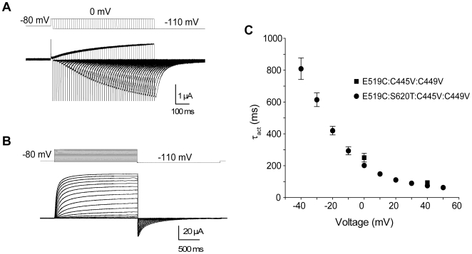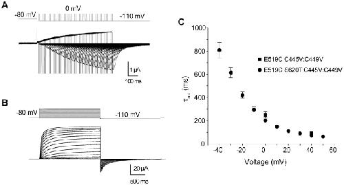 Figure 4. Time course of activation is slow in hERG channels.(A) Representative current traces recorded using an envelope of tails protocol, obtained from the E519C:C445V:C449V mutant. Membrane potential was stepped to 0 mV from −80 mV for varying durations of time and repolarized to −110 mV. The downward pulses are capacitive currents for each pulse. (B) Representative current traces from the E519C:S620T:C445V:C449V channels, using the same two-pulse protocol as in Fig. 2A. (C) Plot of time constants of activation against voltage. Squares represent τact from E519C:C445V:C449V for two voltages (0 and +40 mV), obtained by plotting the peak tails versus test pulse duration (n = 8 for each voltage), then fitting using a single exponential. Circles represent τact from E519C:S620T:C445V:C449V, obtained by fitting the current activation phase with a single exponential (n = 8). |