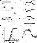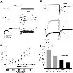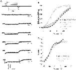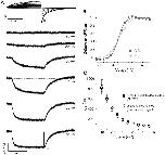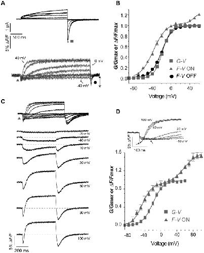 Figure 5. Relationship between E519C:C445V:C449V fluorescence signal and ionic conductance.(A) Representative current (above) and fluorescence traces (below) recorded using the same protocol as in Fig. 2A. (B) Comparison of G-V curve (squares, V½ = −18.3±1.2, k = 8.8±0.2 mV, n = 7) with fluorescence-voltage relationship from the tail of fluorescence (circles, F-VOFF; V½ = −20.6±1.2 mV, k = 11.4±0.6 mV, n = 16), measured at the times indicated by the symbols in panel A, and with fluorescence-voltage relationship from the peak fluorescence quenching upon depolarization (F-VON, triangles in panel A). The F-VON curve was obtained by plotting the maximum amplitude of the downward deflection for each trace, and normalized to +20 mV (estimated saturation voltage), and was best fit with a double Boltzmann function, as a second component appears at positive potentials (first phase: V½,1 = −37.8±1.7 mV, k1 = 13.7±0.7 mV; F-VON second phase: V½,2 = 43.5±7.9, k2 = 9.6±2.6 mV, n = 13; A1 = 0.96±0.2). (C) Representative fluorescence traces obtained during 500 ms depolarizing steps from −80 to potentials ranging from −90 to 100 mV. Membrane was then hyperpolarized at −110 mV for 500 ms. (D) Normalized G-V relationship (squares, V½ = −19.6±2.0, k = 13.8±2.7 mV, n = 3) obtained as in A compared to F-VON (first phase: V½,1 = −46.7±2.1 mV, k1 = 12.7±1.1 mV; F-VON second phase: V½,2 = 56.7±7.2, k2 = 16.9±3.9 mV, n = 3; A1 = 0.56±0.05). The inset shows the fluorescence signal from a representative cell, to highlight the first saturation step at about 0 mV and the second saturation step at about 80 mV. |