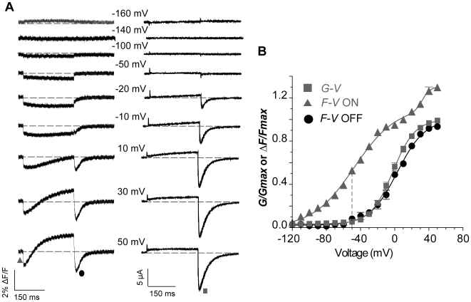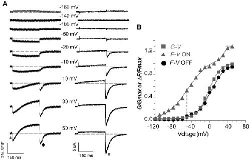 Figure 6. Detection of S4 movement from E519C labelling at potentials negative to channel activation.(A) Representative fluorescence and current traces recorded during 300 ms pulses from a holding potential of −140 mV to potentials ranging from −160 to 50 mV. (B) Comparison of G-V curve (squares, measured from ionic tail currents in A; V½ = −2.2±2.2 mV, k = 12.8±0.2 mV, n = 3) with fluorescence-voltage relationship from the initial quenching (triangles) measured as in Fig. 5B. F-VON curve was best fit with a double Boltzmann function, with F-VON first phase V½,1 = −48.5±2.4 mV, k1 = 23.8±0.1 mV, and F-VON second phase V½,2 = 30.0±5.2 mV, k2 = 4.2±1.4 mV, n = 3 (A1 = 0.83±0.01). Note that between −120 and −50 mV no ionic current was observed, but a fluorescence deflection could be observed positive to −110 mV. The F-VOFF is also shown (circles in panel A, V½ = 2.5±1.8 mV, k = 16.2±2.3 mV, n = 3). |