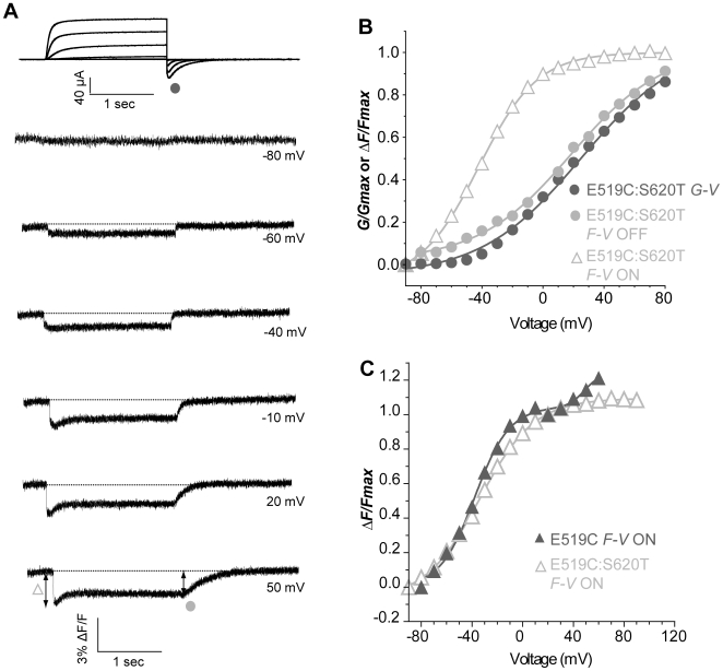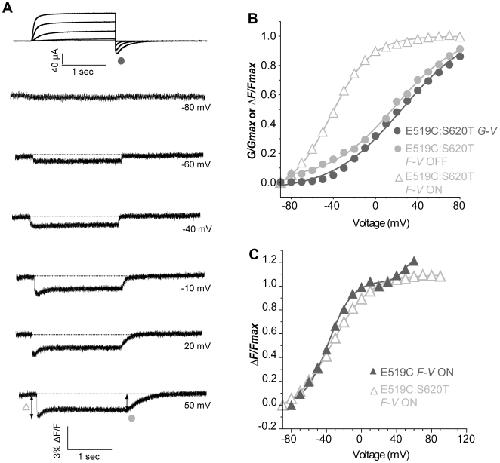 Figure 7. Conservation of the first component of the initial fluorescence quenching in the S620T, inactivation-removed mutant.(A) Representative traces of current and fluorescence from E519C:S620T:C445V:C449V mutant. The protocol used is the same as in Fig. 2A, but depolarization steps were applied from −100 to +120 mV (B) G-V and F-V relationships obtained for the representative cell in A. G-V: V½ = 24.9, k = 32.9 mV; F-VON: V½ = −42.1, k = 19.3 mV; F-VOFF: V½ = 18.4, k = 30.4 mV. (C) Comparison of mean data for the F-VON of E519C:S620T:C445V:C449V (open triangles), V½ = −34.4±1.5, k = 22.2±1.4 mV (n = 10) with F-VON of E519C:C445V:C449V (closed triangles) from Fig. 5B. |