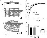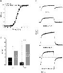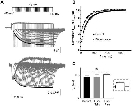 Figure 9. Analysis of activation time course of E519C:C445V:C449V channels and correlation with fluorescence signal.(A) Representative current and fluorescence traces, showing time course of activation measured using an envelope of tails protocol. Membrane potential was stepped from −80 to +40 mV for increasing time periods (15 to 675 ms, with 15 ms intervals), then repolarized to −110 mV. (B) The peak tail current (circles) and fluorescence (triangles) tails, obtained after repolarization from +40, were normalized and plotted against the pulse duration. (C) Time constants of activation of current (black bar) and fluorescence (gray bar), obtained from an exponential fit to the peak tails (represented by black lines in Fig. 8A). The white bar represents the exponential fit of the fluorescence deflection upon depolarization for 2 s to +40 from −80 mV (shown in inset). No significant differences were observed between groups. |