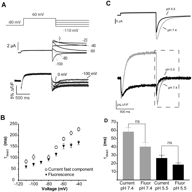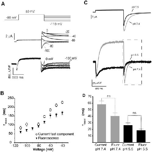 Figure 10. E519C:C445V:C449V tail fluorescence reports on deactivation.(A) Current and corresponding fluorescence reports evoked by a 1 s depolarization to +60 mV from a holding potential of −80 mV, followed by repolarization to potentials ranging from 0 to −110 mV for 2 s. (B) Plot of mean time constants of fluorescence decay fit with a single exponential and the fast time constant of a double exponential fit of current deactivation. (C) Currents (above) and fluorescence (below) evoked by a single pulse to +40 mV from −80 mV at pH 7.4 and 5.5. (D) Comparison of the average time constants obtained using a single exponential fit to the decay of current and fluorescence at pH 7.4 and 5.5. No significant differences were found between time constants of current and fluorescence decay at the two pH's. |
