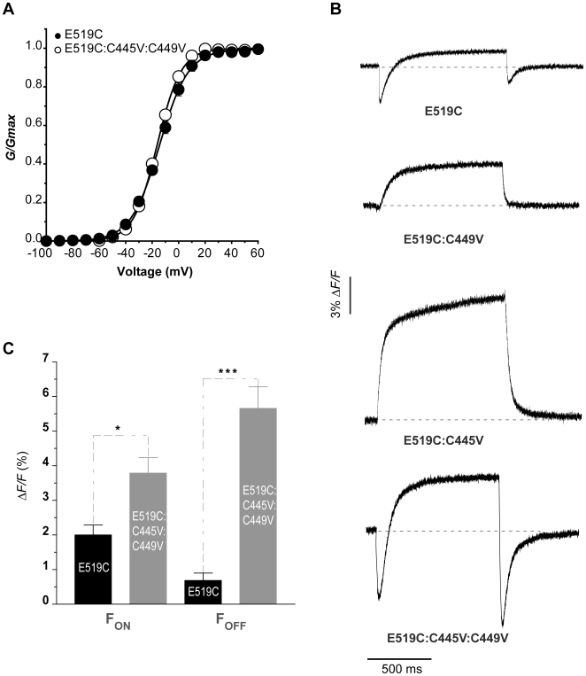 Figure 3. The fluorescence report from E519C is affected by the presence of endogenous cysteine residues.(A) Comparison of E519C (filled circles) and E519C:C445V:C449V (open circles) G-V curves. (E519C V½ = −15.2±1.6 mV and k = 10.6±0.5, n = 8; E519C:C445V:C449V V½ = −18.3±1.2 mV and k = 8.8±0.2, n = 7). In both cases, channels are labelled with TMRM. (B) Representative fluorescence profiles obtained with a depolarizing pulse to +40 mV for 1 s, from a holding potential of −80 mV and returning to −110 mV, comparing the fluorescence signal previously reported for E519C with signals obtained when one or both native cysteines are removed. (C) Graph showing mean fluorescence amplitudes of the initial quenching of E519C (n = 5), and E519C:C445V:C449V (n = 16), and the quenching upon repolarization (* = p<0.05; *** = p<0.0005). “FON” and “FOFF” represent the amplitude of the fluorescence quenching upon depolarization and repolarization, respectively. Data from the two constructs were obtained from the same oocyte batches and recorded the same day. |