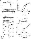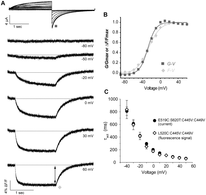 Figure 8. Relationship between L520C:C445V:C449V fluorescence signal and ionic conductance.(A) Representative current and fluorescence traces recorded using the same protocol as in Fig. 2A. (B) The F-V relationship was obtained by plotting the amplitude of fluorescence at the end of the depolarization pulse against voltage (diamonds; V½ = −26.8±1.0 mV, k = 13.3±0.6 mV (n = 10)), and is compared to mean data for G-V (squares; V½ = −28.4±0.7 mV, k = 9.0±0.2 mV (n = 6)). (C) Comparison of time course of activation of E519C:S620T:C445V:C449V channels (circles, from Fig. 4C) with the time course of fluorescence deflection from L520C:C445V:C449V mutant (diamonds, n = 6). The fluorescence signal upon depolarization was fitted with a single exponential and plotted against voltage. |