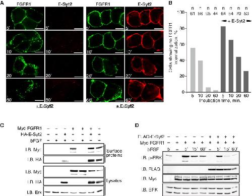 Figure 5. Gain of E-Syt2 Function Inhibits FGFR1 Endocytosis(A) HEK293T cells were transfected with Myc-FGFR1, with or without HA-E-Syt2, treated with bFGF and internalization of plasma membrane receptor followed. Panels show typical image fields of the localization of the initially plasma membrane fraction of FGFR1 and of total E-Syt2 at various times after bFGF addition. Scale bar, 10 μm.(B) Statistical analysis of receptor uptake during analyses as in (A). ânâ indicates the total number of cells analyzed in repeat experiments.(C) Myc-FGFR1 and HA-E-Syt2 were expressed as in (A), but surface proteins were biotin labeled before adding bFGF. Biotin-labeled surface proteins were then isolated and analyzed by immunoblotting (I.B.).(D) Time course of Erk activation following bFGF treatment in the presence or absence of E-Syt2 gain of function. The experiment was performed as in (A), but total protein lysates were recovered at the indicated time following bFGF addition and were analyzed by immunoblotting.See also Figure S5.