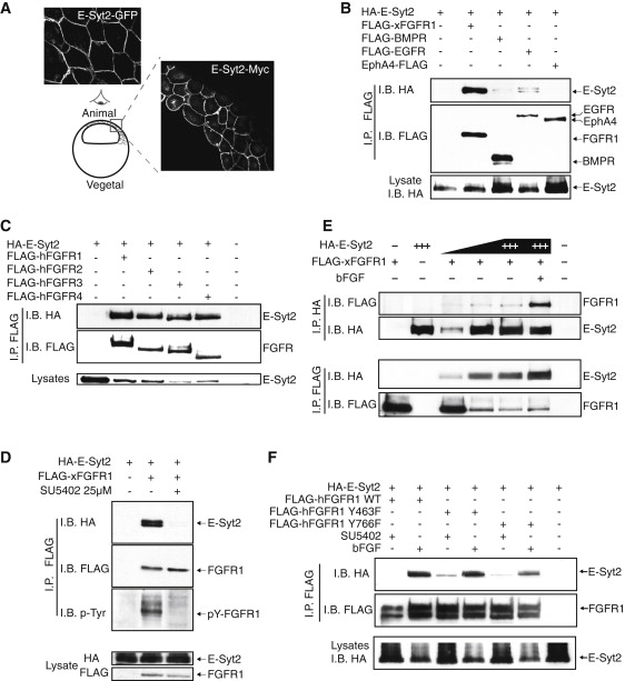 Figure 2. E-Syt2 Is a Membrane Protein that Specifically Interacts with the Activated FGF Receptor(A) E-Syt2-GFP and E-Syt2-Myc fusions were expressed in Xenopus embryos and visualized at blastula either by direct (-GFP) or indirect (-Myc) confocal epifluorescence microscopy.(B) E-Syt2 interacts selectively with FGFR1. HA-tagged E-Syt2 (HA-E-Syt2) was coexpressed with FLAG-tagged Xenopus FGFR1 (xFLAG-FGFR1), Xenopus BMPR (FLAG-BMPR), human EGFR (FLAG-EGFR), or Xenopus Epp (EphA4) (Epp-FLAG) (Winning et al., 1996) in HEK293T cells and anti-FLAG-coimmunoprecipitated (I.P.) complexes were immunoblotted (I.B.).(C) HA-tagged E-Syt2 (HA-E-Syt2) was also coexpressed with the FLAG-tagged human FGF receptors 1 to 4 (FLAG-hFGFR1, 2, etc) and analyzed for coimmunoprecipitation as in (B).(D) E-Syt2 interacts selectively with the activated, tyrosine phosphorylated form of FGFR1. HA-E-Syt2 and FLAG-xFGFR1 were coexpressed in HEK293T cells, FGFR1 inactivated or not with the specific inhibitor SU5402 and proteins immunoprecipitated and blotted as in (B).(E) bFGF enhances the E-Syt2 interaction with FGFR1. FLAG-xFGFR1 and increasing levels of HA-E-Syt2 were coexpressed as in (B) and where indicated cells were treated with bFGF. Extracts were then immunoprecipitated with either anti-HA or anti-FLAG antibodies and blotted as indicated. â+++â indicates highest level of E-Syt2 transfection.(F) The E-Syt2/FGFR1 interaction is independent of the recruitment of downstream factors to the receptor. FLAG-hFGFR1 and the point mutants Y463F and Y766F were coexpressed with HA-E-Syt2, cells treated either with SU5402 or with bFGF as in (D) and (E), and anti-FLAG-coimmunoprecipitated (I.P.) complexes immunoblotted (I.B.).See also Figure S2.