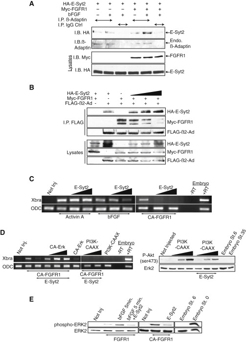 Figure 4. E-Syt2 Interacts with Adaptin-2 to Modulate Receptor Endocytosis, ERK Activation, and Xbra Induction(A) E-Syt2 interacts with the endogenous AP-2 tetramer. HA-E-Syt2 and Myc-tagged FGFR1 (Myc-FGFR1) were coexpressed in HEK293T cells stimulated or not with bFGF. Endogenous AP-2 complexes were immunoprecipitated with a β2-Adaptin-specific antibody or a nonspecific control antibody (IgG Ctrl) and I.B.(B) Both E-Syt2 and FGFR1 interact with the AP-2 complex. β2-adaptin (FLAG-β2-Ad) was coexpressed with FGFR1 (Myc-FGFR1) and with increasing amounts of E-Syt2 (HA-E-Syt2) and complexes were immunoprecipitated with an anti-FLAG antibody (I.P. FLAG). The upper panels show immunoblots for the coprecipitated proteins and the lower panels show protein levels in the input protein lysate.(C) E-Syt2 gain of function also inhibits bFGF and activated FGFR1 (CA-FGFR1)-mediated, but not Activin-mediated Xbra induction in ACs.(D) Left panel, constitutively activated-ERK (CA-ERK) but not constitutively activated PI3K (PI3K-CAAX) expression rescues E-Syt2 inhibition of Xbra induction by CA-FGFR1 in ACs. Right panel, consistent with this PI3K-CAAX activation of Akt in ACs is not strongly affected by E-Syt2 gain of function.(E) E-Syt2 gain of function inhibits ERK activation by CA-FGFR1 (anti-phospho-Erk immunoblot) in ACs.See also Figure S4.