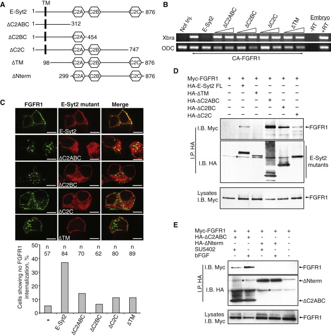 Figure 6. The Transmembrane and the C2C Domains of E-Syt2 Are Both Required for Its Function(A) Schematic representation of the HA-E-Syt2 deletion mutants used.(B) Deletion of either the N-terminal or the C2C domain eliminates the dominant-negative effects of E-Syt2 gain of function on Xbra induction. Mutants were expressed and analyzed in AC induced with CA-FGFR1. Four independent experiments gave consistent results.(C) Only full-length E-Syt2 displays a dominant-negative gain of function effect on FGFR1 internalization. Each E-Syt2 mutant was analyzed in the receptor uptake assay in HEK293T cells as in Figures 5A and 5B. Upper panels show typical immunolocalization of initially membrane-labeled Myc-FGFR1 and of E-Syt2 mutants 20 min after bFGF addition. Scale bar, 10 μm. Lower panel shows statistical analysis of the data.(D) The N-terminal domain of E-Syt2 is required to mediate its interaction with FGFR1. E-Syt2 mutants were coexpressed with Myc-FGFR1 in HEK293T cells, and HA immunoprecipitates (I.P.) were analyzed by immunoblotting (I.B.).(E) The HA-δC2ABC mutant containing only the first 312 aa of E-Syt2 displays selective binding to activated FGFR1. The analysis in D was repeated for the mutant HA-δC2ABC, but cells were treated with either bFGF or with the inhibitor SU5402 before immunoprecipitation and the analysis of Myc-positive complexes.In (D) and (E), the asterisk indicates the unspecific detection of an endogenous protein by the HA antibody assay.See also Figure S6.