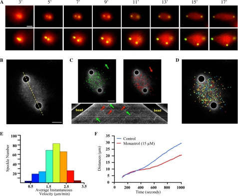 FIGURE 1. Characterization of spindle-like structures stimulated by AurA beads and RanGTP. A, time lapse frames showing formation of bipolar or multipolar spindle-like structures. Clusters of two to three AurA beads initially nucleate MT asters. The separation of the beads within the asters leads to formation of either bipolar or multipolar spindle-like structures (see supplemental Movies S1 and S2). The time (minutes) above the images corresponds to the time following initiation of the reaction that the images were taken. B, MT speckle images of one bipolar spindle-like structure that is undergoing elongation. AurA beads are masked to visualize the speckles better. The yellow dashed line indicates the region used for kymograph analysis in C. C, speckles, labeled green or red, moving toward each of the AurA beads, are demonstrating speckle movement in each direction. Below, a kymograph shows the speckle movements with respect to the movement of AurA beads. D, speckles color coded according to their average instantaneous speckle velocities shown on the histogram in E (flux rate, 2.229; S.D., 0.532; speckles tracked, 632). The same bipolar spindle-like structure shown in C was used. F, reduction of the rate of AurA bead separation in bipolar spindle-like structures by inhibiting Eg5 with 15 μm Monastrol. The distances between two AurA beads during spindle assembly in the presence or absence of Monastrol were measured and plotted against time. The plot shows average distance for each time point across all four experiments for each condition. Scale bars, 10 μm.