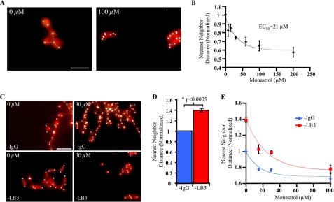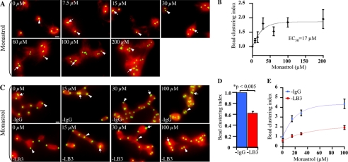 FIGURE 3. LB3 limits whereas Eg5 promotes the separation of clustered AurA beads during formation of spindle-like structures. A, images of MT structures formed in the presence or absence of various concentrations of Monastrol at 15 min into the reaction. B, increase of AurA bead clustering caused by Eg5 inhibition. Quantification of the bead-clustering index at different concentrations of Monastrol is shown. Values are normalized to 0 μm Monastrol (dimethyl sulfoxide carrier) to allow comparisons among different egg extracts. Monastrol caused a dose-dependent increase in AurA-bead-clustering. C, images of AurA beads in MT structures assembled in the presence or absence of LB3 and Monastrol at 15 min into the reaction. D, decrease in AurA bead clustering caused by LB3 inhibition. Quantification of the bead-clustering index in the presence or absence of LB3 without inhibiting Eg5 is shown. E, depletion of LB3 relief of the clustering effect caused by Monastrol. Quantification of clustering index in the presence or absence of LB3 and an increasing concentration of Monastrol is shown. Arrows and arrowheads in all images indicate clustered and separated AurA beads, respectively. Error bars are S.E. from at least three experiments performed in different egg extracts on different days with 700 beads counted per condition per experiment. Scale bars, 10 μm.