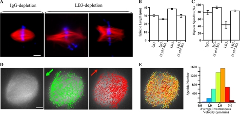 FIGURE 4. Effects of LB3 and Eg5 on the length, poles, and MT flux of spindles assembled from sperm chromatin. A, images of spindles formed in mock-depleted and LB3-depleted egg extracts. LB3 depletion resulted in larger spindles and an increase in multipolar spindles. B, quantifications of spindle length, excluding half-spindles and monopolar spindles, in both mock-depleted and LB3-depleted extracts in the presence or absence of 15 μm Monastrol. Monastrol rescued the spindle length change caused by LB3 depletion. C, quantification of the percentage of bipolar spindles, excluding half-spindles and monopolar spindles, in mock-depleted extracts and LB3-depleted extracts in the presence or absence of 15 μm Monastrol. LB3 depletion caused a decrease in the percentage of bipolar spindles, which was corrected with the addition of 15 μm Monastrol. Approximately 35 spindles were analyzed per condition per experiment, and three experiments performed on different days were used for quantifications. Error bars, S.E. D, speckle images of sperm spindles. The gray image shows a frame of the speckled spindle. Speckles moving toward opposite spindle poles are labeled as green and red dots. E, speckle trajectories color-coded according to their average instantaneous speckle velocities shown on the histogram to the right (flux rate, 2.031; S.D., 0.488; speckles tracked, 4488). Scale bars, 10 μm.