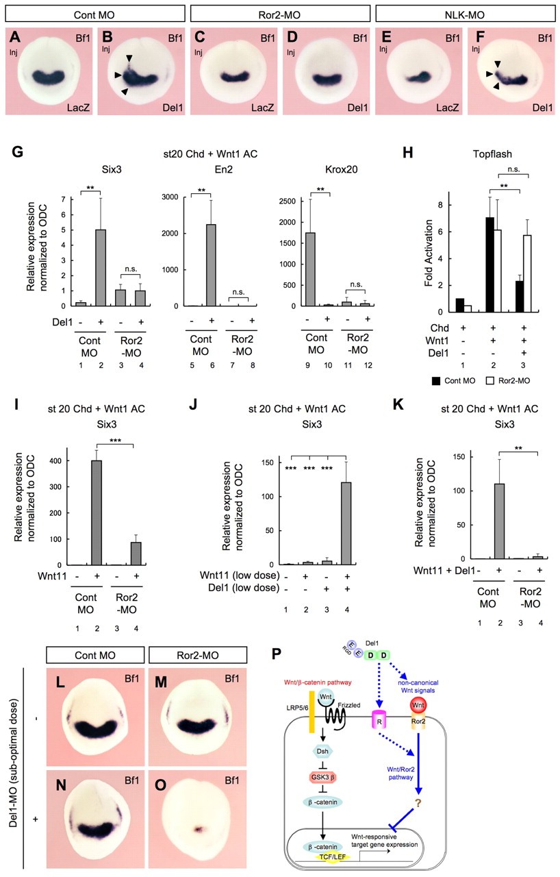 Fig. 6. The Ror2 pathway is essential for Del1 function. (A-F) Combinations of Del1 (400 pg), lacZ (400 pg), control-MO (4 ng), Ror2-MO (4 ng) and NLK-MO (4 ng) as shown were injected into the two unilateral animal blastomeres at the 8-cell stage and harvested at the neurula stage. Arrowheads indicate expansion of Bf1. Ror2-MO injection at a dose higher than 4 ng frequently caused spina bifida or exogastrulation in vivo, presumably because of convergent-extension defects. (G) Animal caps were injected with combinations of Chd (100 pg), Wnt1 (5 pg), Del1 (500 pg), control-MO (8 ng) and Ror2-MO (8 ng) as shown, cultured until the siblings reached stage 20, and analyzed by qPCR. (H) Animal caps were injected with Chd (100 pg), Wnt1 (10 pg), Del1 (500 pg), control-MO (8 ng) or Ror2-MO (8 ng) and analyzed for luciferase activity. (I) Animal caps were injected with combinations of Chd (100 pg), Wnt1 (5 pg), Wnt11 (200 pg), control-MO (8 ng) and Ror2-MO (8 ng) as shown, cultured until the siblings reached stage 20, and analyzed by qPCR. (J,K) Animal caps were injected with combinations of Chd (100 pg), Wnt1 (5 pg), Wnt11 (10 pg), Del1 (200 pg), control-MO (8 ng) and Ror2-MO (8 ng) as shown, cultured until the siblings reached stage 20, and analyzed by qPCR. **, P<0.01; ***, P<0.001. n.s., not significant. Error bars represent s.d. (L-O) Animal cell injection of Del1-MO (10 ng) and Ror2-MO (4 ng) coordinately suppressed the expression of Bf1 at the neurula stage. The frequency of strong Bf1 suppression was: 0%, n=29 (L); 0%, n=47 (M); 9%, n=43 (N); 80%, n=35 (O). (P) Working hypothesis for Del1 function in the modulation of the canonical Wnt pathway (see text for details). E, EGF-like domain; D, Discoidin domain; R, presumptive Del1 receptor; LRP5/6, LDL receptor-related protein 5/6. Question marks indicate presumptive intracellular modulator(s) of the Wnt/Ror pathway.