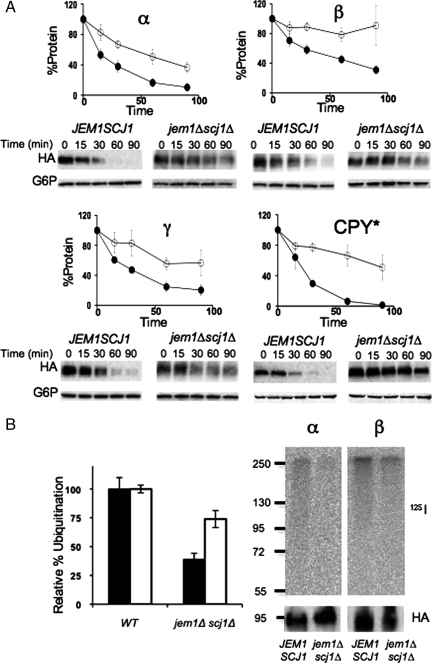The epithelial sodium channel (ENaC) is composed of a single copy of an alpha-, beta-, and gamma-subunit and plays an essential role in water and salt balance. Because ENaC assembles inefficiently after its insertion into the ER, a substantial percentage of each subunit is targeted for ER-associated degradation (ERAD). To define how the ENaC subunits are selected for degradation, we developed novel yeast expression systems for each ENaC subunit. Data from this analysis suggested that ENaC subunits display folding defects in more than one compartment and that subunit turnover might require a unique group of factors. Consistent with this hypothesis, yeast lacking the lumenal Hsp40s, Jem1 and Scj1, exhibited defects in ENaC degradation, whereas BiP function was dispensable. We also discovered that Jem1 and Scj1 assist in ENaC ubiquitination, and overexpression of ERdj3 and ERdj4, two lumenal mammalian Hsp40s, increased the proteasome-mediated degradation of ENaC in vertebrate cells. Our data indicate that Hsp40s can act independently of Hsp70 to select substrates for ERAD.