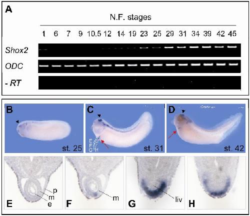 Supplemental Figure II. Expression of Shox2 in Xenopus laevis. (A) Developmental RT-PCR of