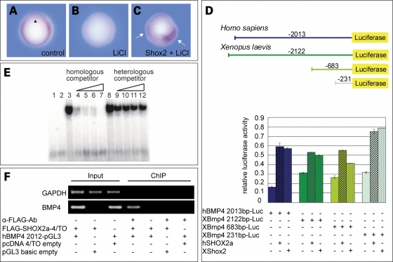 Figure 2. Shox2 regulates the expression of Bmp4. (A) Bmp4 expression in uninjected embryos at stage 10.5 (n=35). Black arrowhead indicates the dorsal lip. (B) Bmp4 expression is reduced or absent in 87% of LiCl-treated embryos (n=31). (C) Spots of Bmp4 expression in 77% of previously Shox2-injected, LiCl-treated embryos (n=30). Shox2 RNA was injected diagonally into two blastomers of a 4-cell stage embryo. Bmp4 staining in two areas of the embryo (marked by white arrows) indicates an upregulation of Bmp4 expression corresponding to the Shox2 injection. (D) Shox2 increases the activity of the human and Xenopus laevis Bmp4 promoter upon co-transfection of Shox2 expression plasmids (1 µg) and the indicated Bmp4 reporter-constructs (1 µg) into Cos-7 cells. Data using HEK-293 cells are not shown. (E) Electrophoretic mobility shift assay of the GST–SHOX2 fusion protein on a conserved promoter oligonucleotide sequence (BMP4). An excess of non-radioactively labelled oligonucleotides (homologous competitor) reduces the DNA-binding ability of SHOX2, whereas excess of a random oligonucleotide sequence (heterologous competitor) does not affect DNA-binding. 1, free oligonucleotide; 2, GST alone; 3, GST–SHOX2; 4–7, 10-fold, 50-fold, 75-fold and 150-fold molar excess of homologous competitor; 8, GST–SHOX2; 9–12, 10-fold, 50-fold, 75-fold and 150-fold molar excess of heterologous competitor. (F) Chromatin immunoprecipitation (ChIP) assay. HEK-293 cells were co-transfected with the FLAG-SHOX2a expression or empty control vector and with either the hBMP4 2013-Luc reporter or empty control vector as indicated. Formaldehyde-crosslinked DNA was immunoprecipitated using an anti-FLAG antibody (α-FLAG-Ab) or no antibody, as a negative control. Precipitated DNA fragments (ChIP) and DNA from lysate before immunoprecipitation (Input) were subjected to PCR using primer sets amplifying the putative SHOX2-binding element in the BMP4 gene (lower panel) or GAPDH (upper panel) as a control.