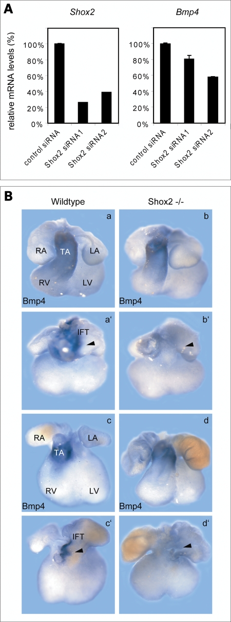 Figure 4. Shox2 deficiency impairs Bmp4 expression. (A) H10 cells were transfected with two different Shox2 siRNAs (Shox2 siRNA1 and Shox2 siRNA2) in parallel with a control siRNA. Expression levels of Shox2 (left panel) and Bmp4 (right panel) were assessed 24 h after transfection by qRT–PCR analysis. siRNA-mediated knock-down of Shox2 results in 19–42% reduction of Bmp4 mRNA levels. All results were normalized to Hprt1 (hypoxanthine phosphoribosyltransferase 1) mRNA values. (B) Whole-mount in situ hybridization on E11.5 (a, b) and E12.5 (c, d) wild-type and Shox2−/− mouse hearts using a Bmp4 RNA probe. Both, ventral (a–d) and dorsal (a′–d′) views are shown. Murine Bmp4 is strongly expressed in the truncus arteriosus (TA) (a, c) and in the inflow tract (a′, c′) of the developing heart in wild-type embryos. In the Shox2−/− mouse hearts, Bmp4 expression is still present in the truncus arteriosus (b, d) but completely absent in the IFT (b′, d′), where Shox2 and Bmp4 expression domains overlap in the wild-type heart. RA, right atrium; LA, left atrium; RV, right ventricle; LV, left ventricle.
