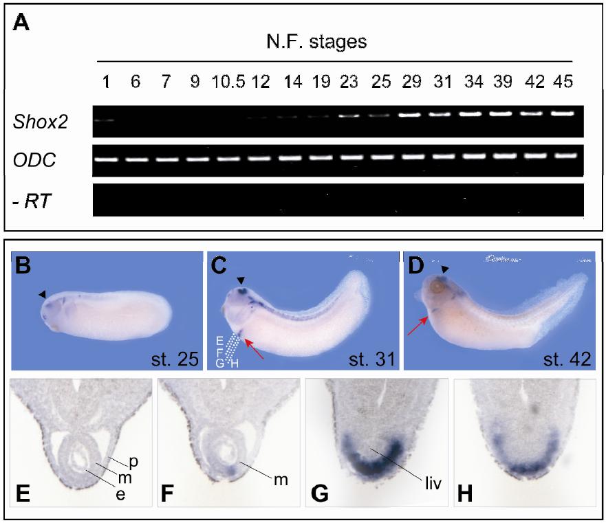 detected at stage 23 and expression persists up to stage 45. (B-D) Spatial expression of Shox2 during