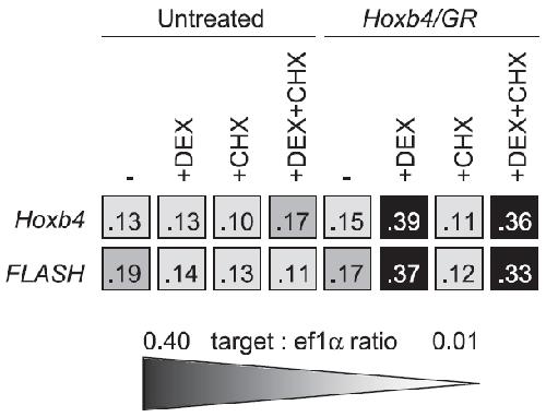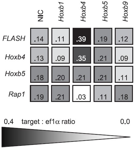 expression of FLASH, Hoxb4, Hoxb5, Rap1 or ef1a by RT-QPCR. Note