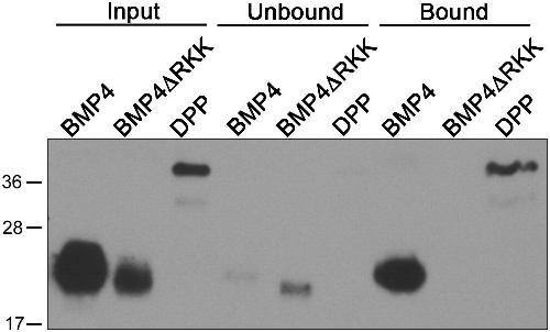 Fig. S1. Myc-epitope-tagged Dpp retains heparin binding capacity. Xenopus BMP4myc, BMP4ÎRKKmyc (in which the heparin binding domain has been deleted) or Dpp6Xmyc precursor proteins were expressed in HEK cells. Cell media was incubated with heparin-sepharose beads which were washed to remove unbound proteins and then boiled to release bound proteins. Western blots of cell media (input) or proteins that did not (unbound) or that did (bound) bind to heparin beads were probed with antibodies specific for the myc-tag in the mature domain.